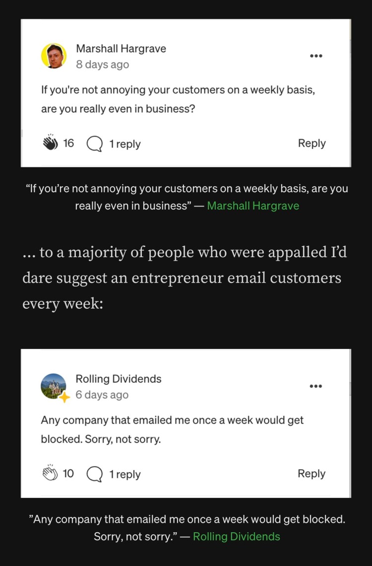 In a previous previous article by Aaron Dinin, a sparked a healthy debate in the comments section (and my inbox!) about the appropriate amount of times a company can email its customers before those customers get annoyed. In the article, I discuss an entrepreneur building a soap company who was struggling to get repeat buyers because she wasn’t re-engaging her customers. I encouraged the entrepreneur to be emailing her customers every week. The responses ranged from a minority of people who agreed that constant re-engagement was key: