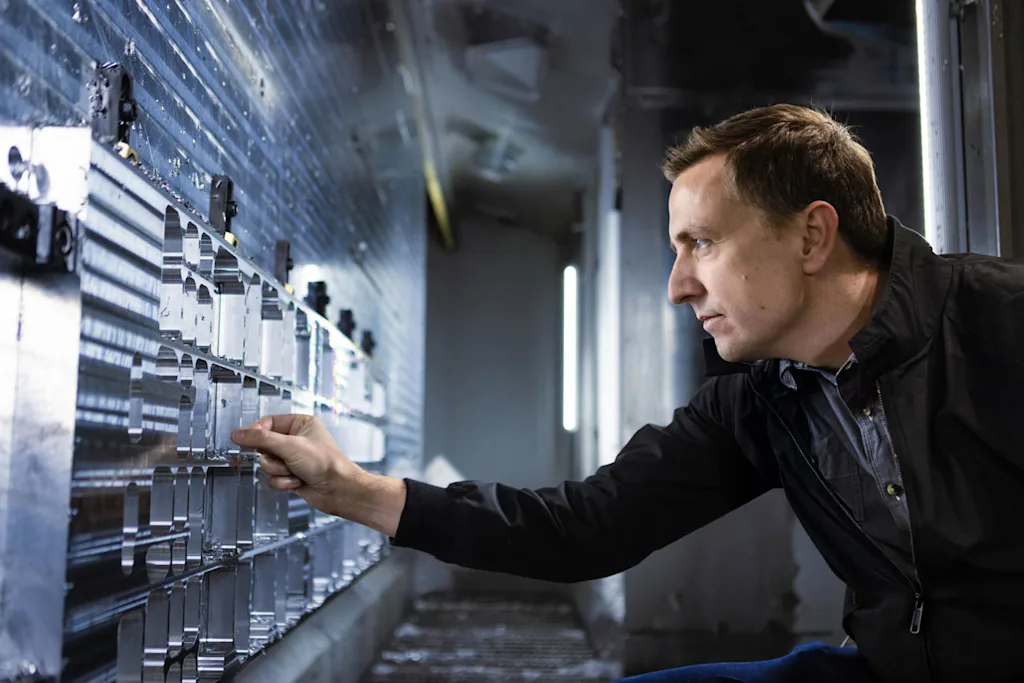 A lightly used second-hand model—Gedmark thinks it was formerly used in the production of F-35 fighter jets—Astranis’s Mag3.EX allows the company to make its own parts out of blocks of aluminum alloy. The process is responsible for the oily whiff of coolant in the air and produces detritus in the form of humongous quantities of tiny aluminum shards. They sit by the vatful near the Mag3.EX, awaiting recycling.